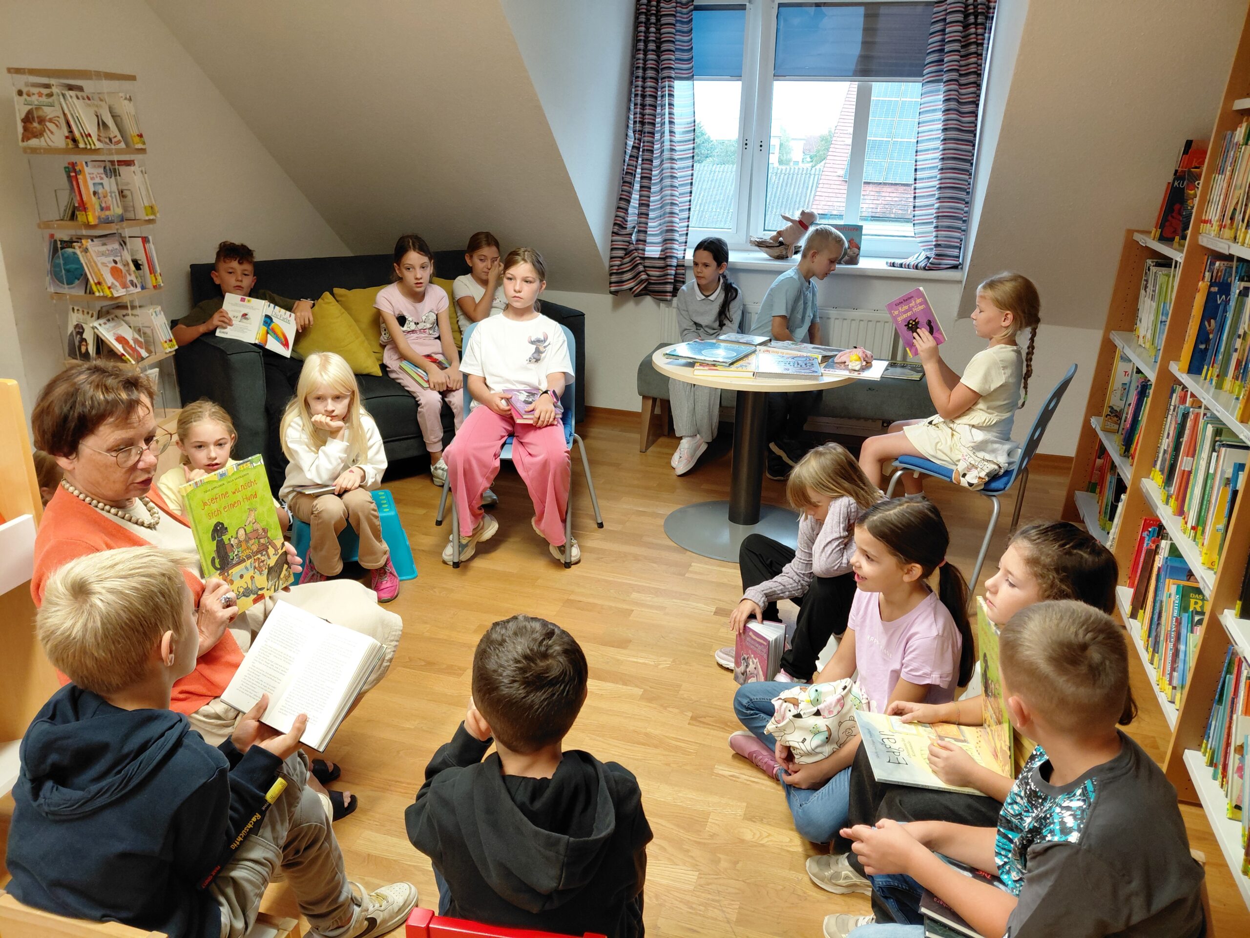 Wir besuchen wie schon letztes Schuljahr einmal im Monat die Orther Bibliothek. Dort dürfen wir schmöckern, uns Bücher ausborgen und Brigitte liest uns auch immer etwas Spannendes oder Lustiges vor.