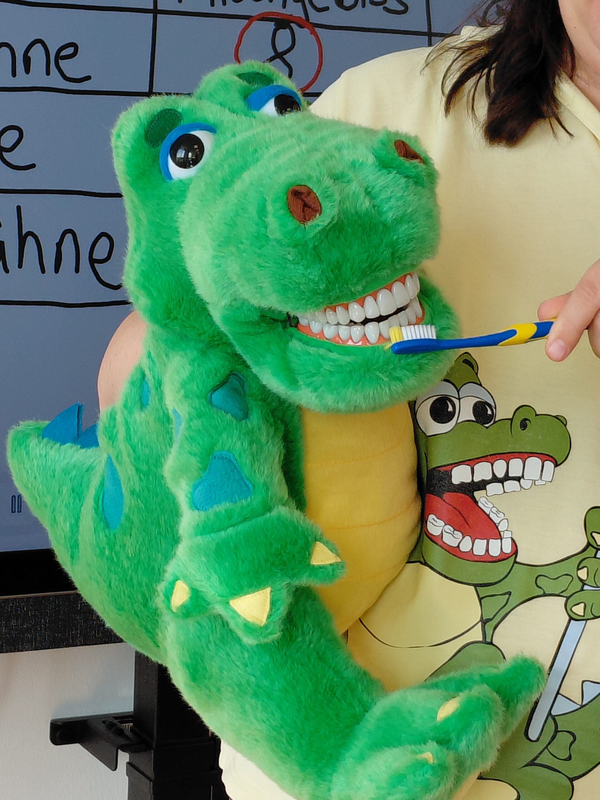 Kroko, das Zahnputzkrokodil, hat uns besucht. Wir haben einiges über unsere Zähne gelernt und wiederholt, wie man richtig Zähne putzt.