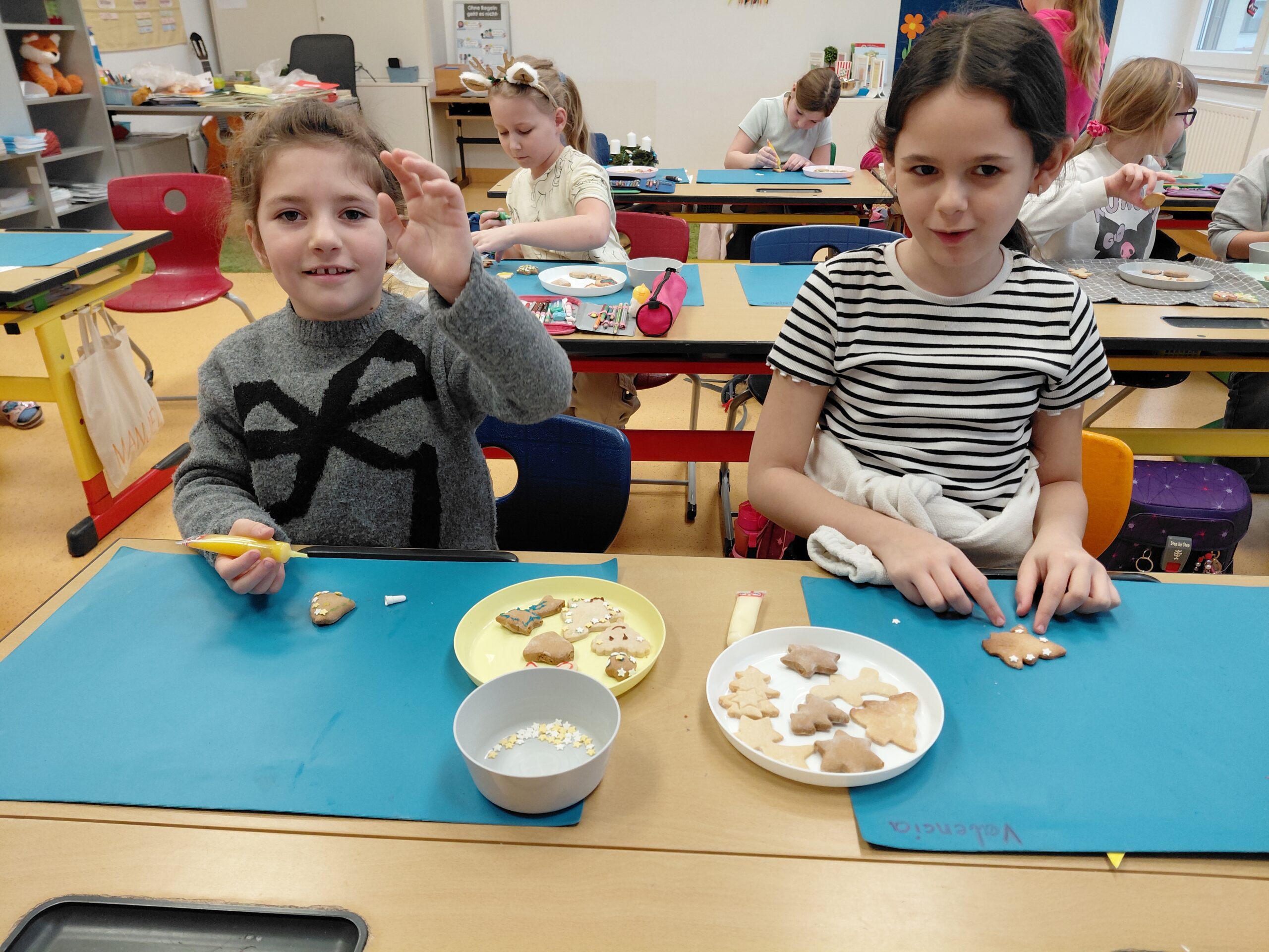 Zur Weihnachtszeit gehört das Keksebacken. Das haben wir in unserer Klasse auch gemacht. Nach dem Backen wurde noch fleißig verziert.