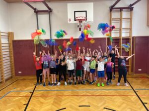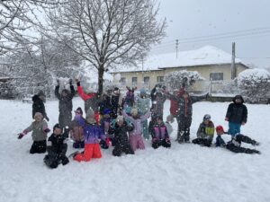 Im November war es endlich so weit: Während der Turnstunde tanzten die ersten Schneeflocken vor unserem Fenster. Mit bunten Tüchern haben wir den Schneefall nachgespielt und gemeinsam eine kleine, gemütliche Winterstunde mit Weihnachtsliedern erlebt.