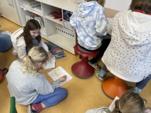 Etwa zweimal im Monat besuchen wir die öffentliche Bibliothek. Dort dürfen sich alle selbst ein Buch aussuchen und in die Welt der Geschichten eintauchen. Besonders freuen wir uns immer, wenn Brigitte uns ein spannendes, lustiges oder liebevolles Buch vorliest – dann wird die Bibliothek zu einem ganz besonderen Ort voller Fantasie und Abenteuer!