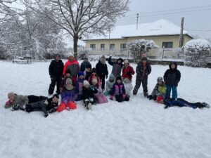 Im November war es endlich so weit: Während der Turnstunde tanzten die ersten Schneeflocken vor unserem Fenster. Mit bunten Tüchern haben wir den Schneefall nachgespielt und gemeinsam eine kleine, gemütliche Winterstunde mit Weihnachtsliedern erlebt.