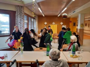 Auch dieses Jahr feierten wir wieder Fasching in der Klasse. Viele Kinder verkleideten sich. Wir spielten gemeinsam und aßen Krapfen. Nach einer Polonaise gingen wir ins Pflegeheim und führten dort etwas auf. Es war ein schöner und besonderer Schultag.